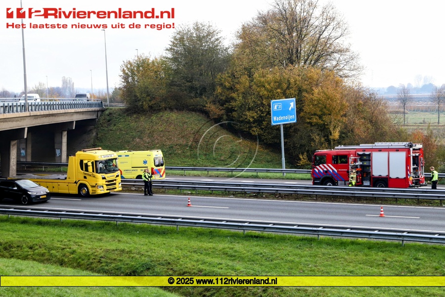 Wadenoijen - Vrachtwagen tegen vangrail op de A15