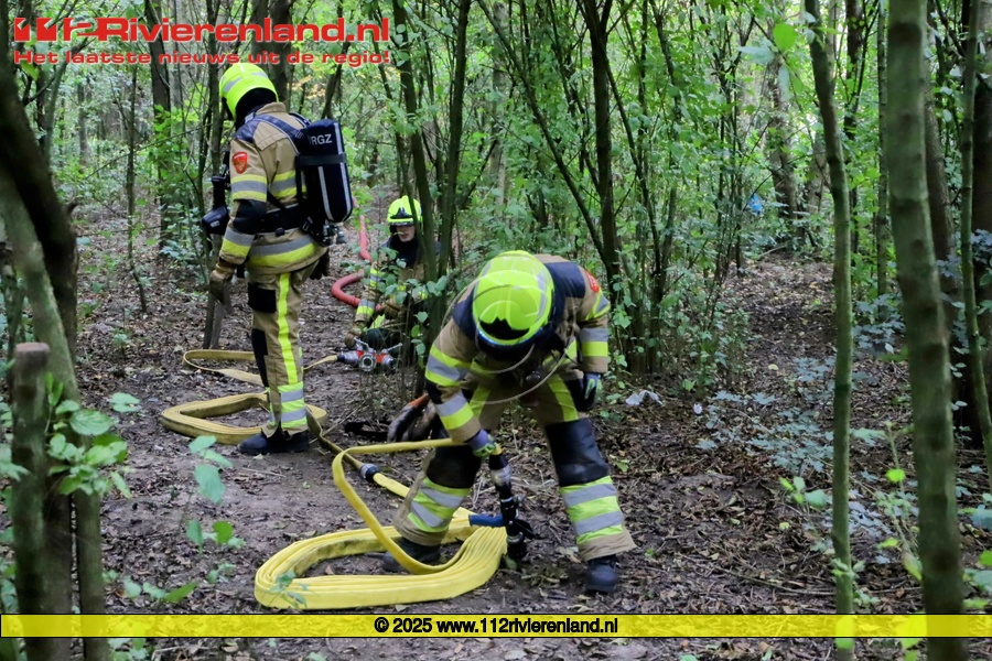 De brandweer heeft een aantal slangen moeten aanleggen door het bosgebied en heeft daarna de brand met veel water kunnen blussen.