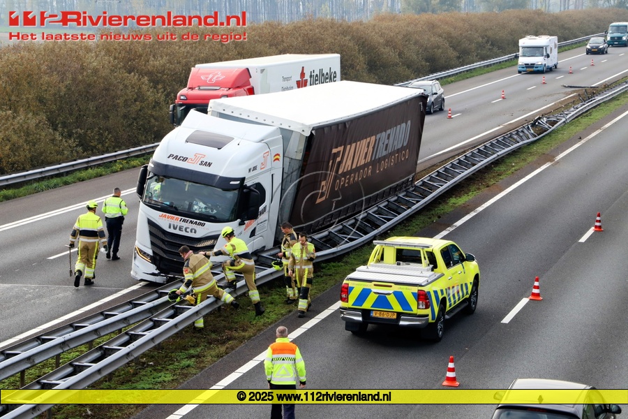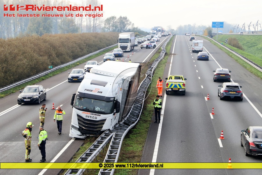 Wadenoijen - Vrachtwagen tegen vangrail op de A15