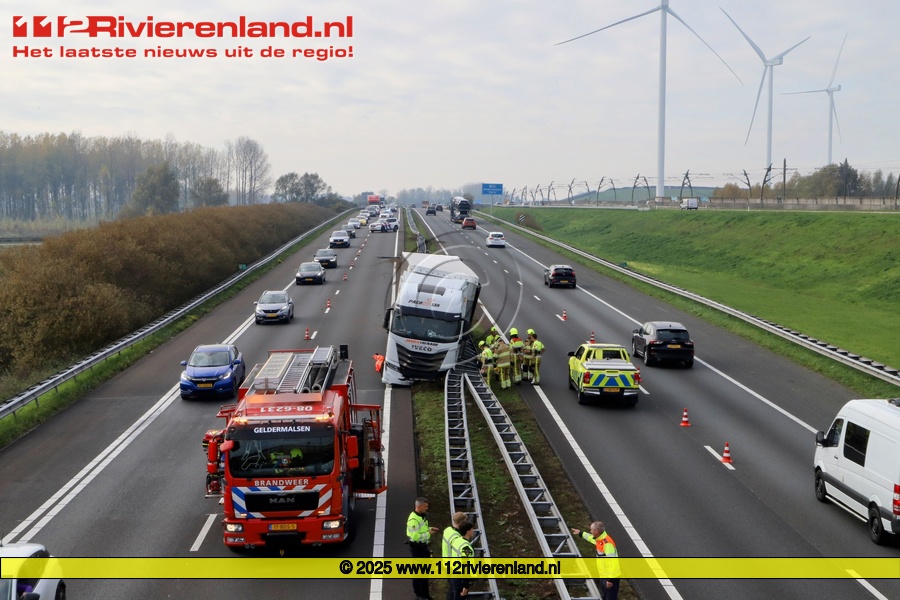 Zaterdag om 11.05 uur werd er een ongeval gemeld op de A15 richting Nijmegen ter hoogte van de afslag Wadenoijen. Hierbij belandde een geladen vrachtwagen met trailer tegen de middenvangrail.