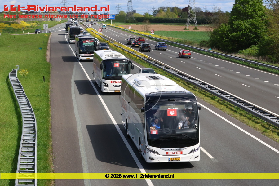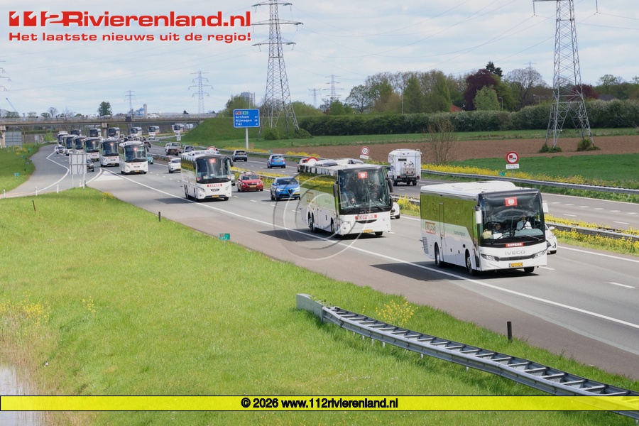 In groepen van ongeveer 40 bussen vanuit Nijmegen kwamen er ruim 200 over de A15 die allemaal richting de Kuip gingen.
